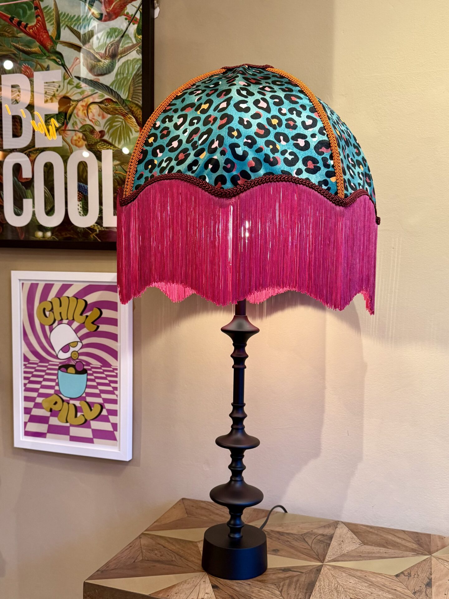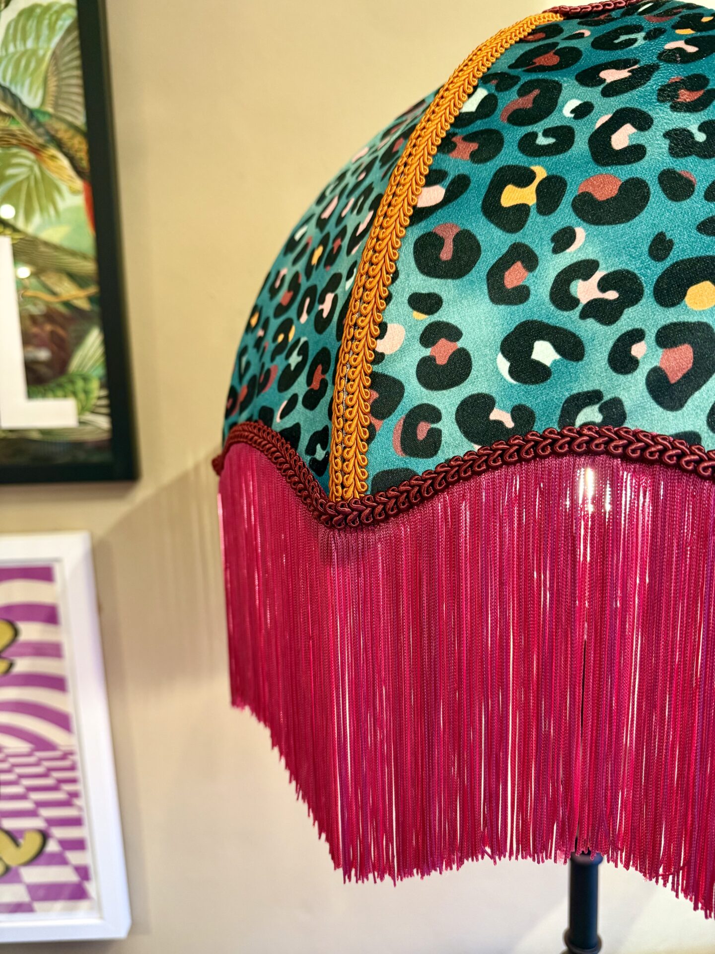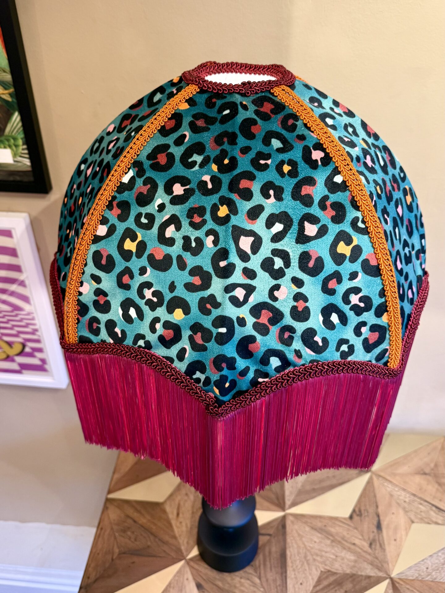 Our Hand sewn fringed lampshade is made with loving care in our Shropshire workshop, using a striking Multi coloured Leopard print soft Velvet with a green background, designed by Becca Who. The Velvet is hand stretched onto the frame and hand stitched into place. The shade is then fully lined in a white material to reflect the light and again hand stitched into place. Finally we then add the fringing, a thick double layer of fringing is added in a contrasting Cerise and then a further layer of wine coloured feather braiding over the fringing and at the top of the shade. We then a double layer of orange braiding running down the seams. A truly unique hand made item. We also provide a carrier fitting to rest your shade onto a lamp or a spider fitting to attach to your ceiling fitting, both are easy to fit. The Lampshade shown on our images is a 45cm Diameter.