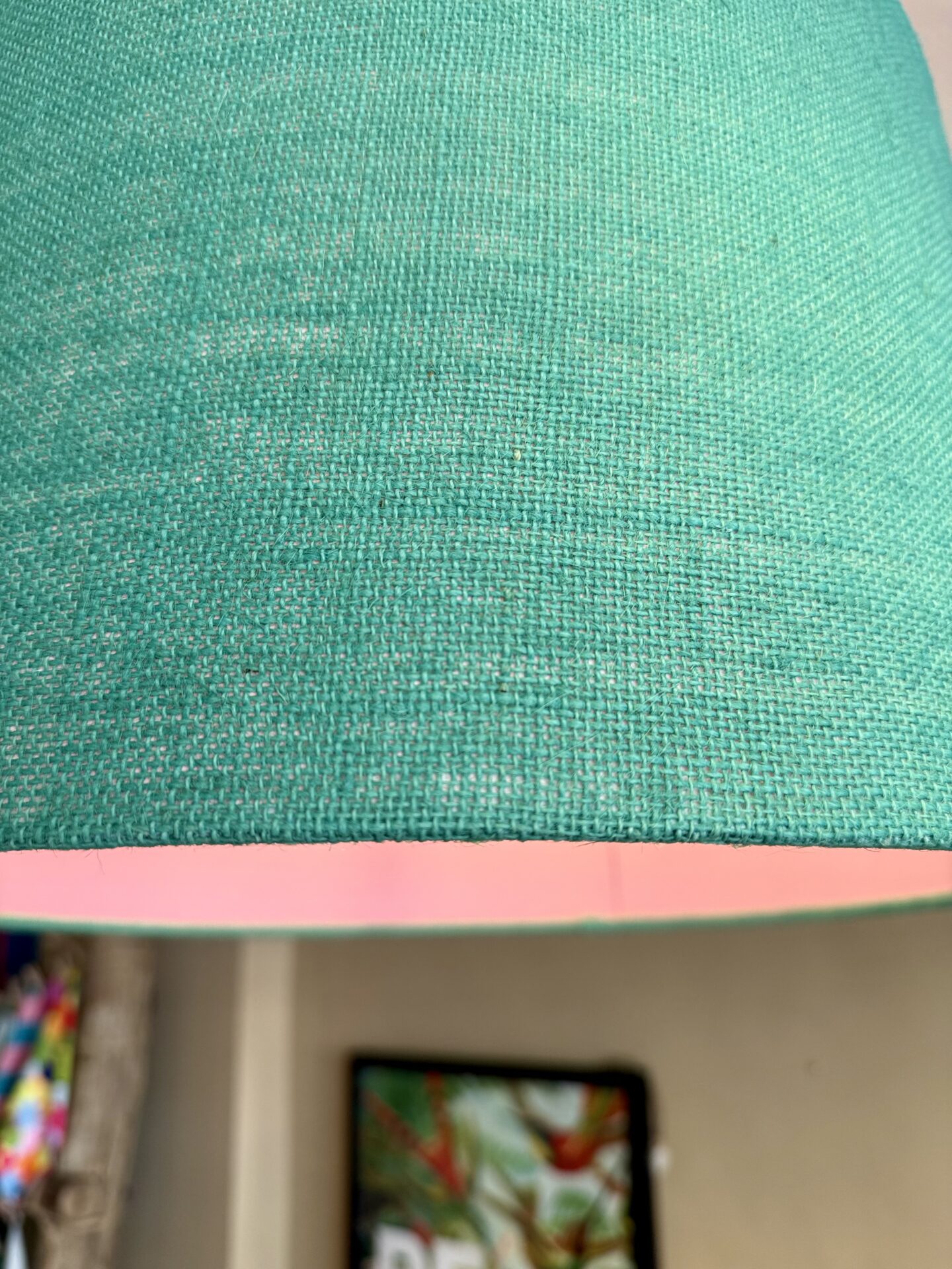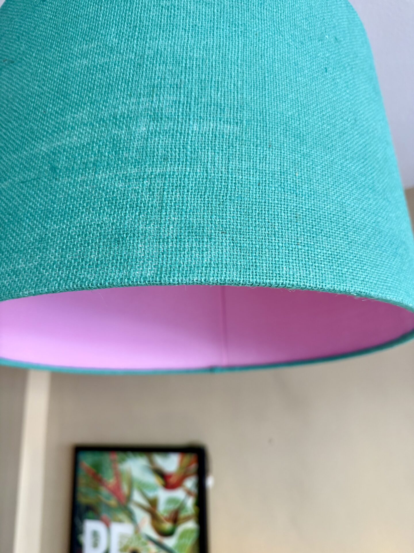 We’re loving this combination of Marine colored Hessian on the outside, providing great texture to the fine candy pink cotton on the inside. When lit the pink reflects lightly through the hessian. Hand made and crafted by ourselves in our Shropshire workshop. can be made in a variety of sizes.