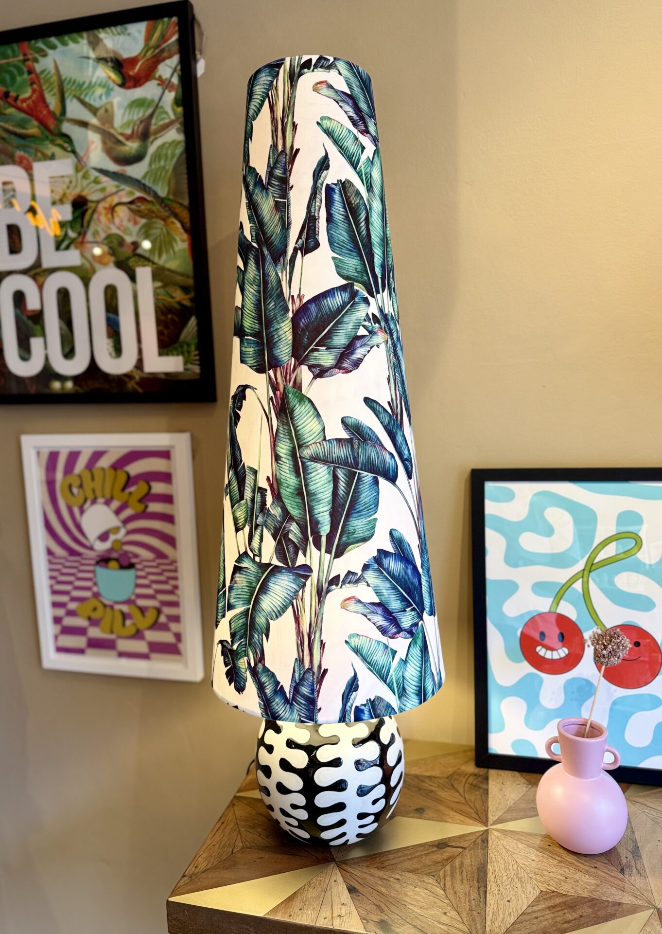 Our Paradise palm Cone lampshade has a modern twist on the 50’s cone shaped shade, covered in a velvet material with a crisp white background and printed with bunches of green and blue toned palm leaves.  Lined in a white laminate to reflect the light through.  A true statement piece.  Shown here with our Elkorn Coral lamp.