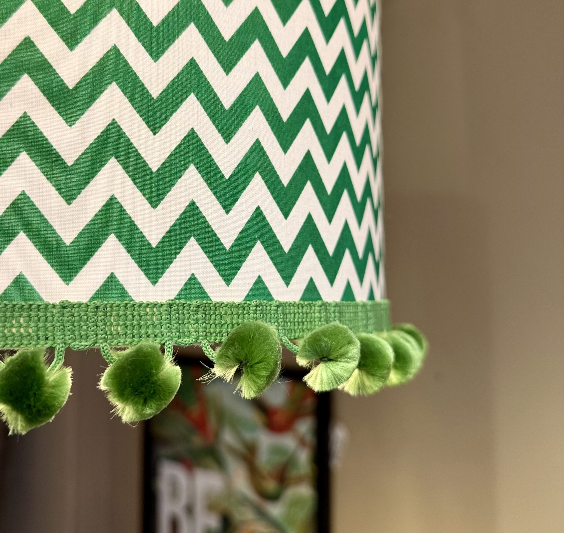 Add this stand out lampshade to your ceiling or lamp, covered in a zig zag apple green cotton material with a white laminate lining which allows the full light to reflect through. We have then added a matching green Pom Pom fringe, which adds a fun finish to the shade. All hand made in our Shropshire workshop. Available in a variety of sizes.